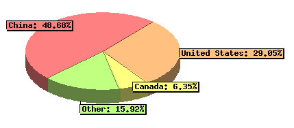 | 48.68 % | China | | 29.05 % | United States | | 6.35 % | Canada | | 1.56 % | | | 1.54 % | | | 1.52 % | United Kingdom | | 1.51 % | | | 1.43 % | | | 0.97 % | India | | 0.95 % | France | | 0.94 % | | | 0.90 % | | | 0.60 % | | | 0.58 % | | | 0.49 % | | | 0.44 % | | | 0.39 % | Russian Federation | | 0.38 % | Unresolved/Unknown | | 0.19 % | Spain | | 0.17 % | Australia | | 0.17 % | | | 0.17 % | | | 0.17 % | Netherlands | | 0.13 % | Japan | | 0.13 % | Germany | | 0.11 % | European Union (non-specific location) | | 0.05 % | Belgium | | 0.04 % | Iran, Islamic Republic of | | 0.04 % | Ukraine | | 0.03 % | Lebanon | | 0.03 % | Reserved address space | | 0.03 % | Moldova, Republic of | | 0.02 % | | | 0.02 % | Czech Republic | | 0.02 % | Brazil | | 0.02 % | Norway | | 0.02 % | Bulgaria | | 0.02 % | Lithuania | | 0.01 % | Seychelles | | 0.01 % | Chile | | 0.01 % | Sweden | | 0.01 % | Malaysia | | 0.01 % | Philippines | | 0.01 % | Jordan | | 0.01 % | Italy | | 0.01 % | Slovakia | | 0.00 % | Viet Nam | | 0.00 % | South Africa | | 0.00 % | Romania | | 0.00 % | Indonesia | | 0.00 % | Argentina | | 0.00 % | Singapore | | 0.00 % | Pakistan | | 0.00 % | Mexico | | 0.00 % | Ireland | | 0.00 % | Morocco | | 0.00 % | Denmark | | 0.00 % | Poland | | 0.00 % | Bangladesh | | 0.00 % | Uruguay | | 0.00 % | Greece | | 0.00 % | Korea, Republic of | | 0.00 % | Hong Kong | | 0.00 % | Thailand | | 0.00 % | Latvia | | 0.00 % | Tunisia | | 0.00 % | Taiwan, Republic of China | | 0.00 % | Angola | | 0.00 % | New Caledonia | | 0.00 % | Venezuela | | 0.00 % | Serbia | | 0.00 % | Turkey | | 0.00 % | Ecuador | | 0.00 % | Israel | | 0.00 % | Bosnia and Herzegovina | | 0.00 % | Curacao | | 0.00 % | Kazakhstan | | 0.00 % | Syrian Arab Republic | | 0.00 % | Afghanistan | | 0.00 % | Jamaica | | 0.00 % | Nepal | | 0.00 % | Switzerland | | 0.00 % | Georgia | | 0.00 % | Kyrgyzstan | | 0.00 % | Colombia | | 0.00 % | Costa Rica | | 0.00 % | Oman | | 0.00 % | Senegal | | 0.00 % | El Salvador | | 0.00 % | Hungary | | 0.00 % | Portugal | | 0.00 % | Egypt | | 0.00 % | Armenia | | 0.00 % | Austria | | 0.00 % | Ethiopia | | 0.00 % | Uganda |