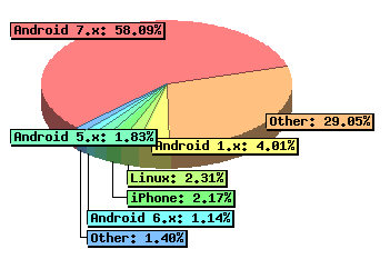 | 58.09 % | Android 7.x | | 29.05 % | Other | | 4.01 % | Android 1.x | | 2.31 % | Linux | | 2.17 % | iPhone | | 1.83 % | Android 5.x | | 1.14 % | Android 6.x | | 0.78 % | iPad | | 0.50 % | Macintosh | | 0.03 % | Android 4.x | | 0.03 % | Windows 7 | | 0.01 % | Windows XP | | 0.01 % | Android 9.x | | 0.01 % | Windows Vista | | 0.01 % | Android 2.x | | 0.01 % | Unix | | 0.00 % | Windows 8 | | 0.00 % | Windows 2003 Server | | 0.00 % | SunOS | | 0.00 % | Windows NT | | 0.00 % | Windows 2000 | | 0.00 % | Windows CE | | 0.00 % | Android 8.x | | 0.00 % | Windows 95 | | 0.00 % | Macintosh PPC | | 0.00 % | Windows 98 |