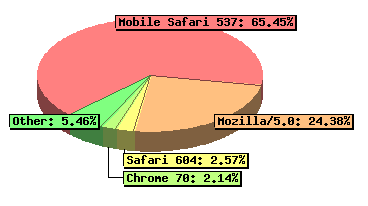 | 65.45 % | Mobile Safari 537 | | 24.38 % | Mozilla/5.0 | | 2.57 % | Safari 604 | | 2.14 % | Chrome 70 | | 1.55 % | Safari 537 | | 0.51 % | Chrome 119 | | 0.43 % | Safari 605 | | 0.32 % | Chrome 116 | | 0.22 % | Chrome 78 | | 0.16 % | Chrome 131 |