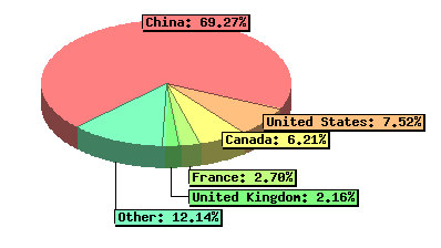 | 69.27 % | China | | 7.52 % | United States | | 6.21 % | Canada | | 2.70 % | France | | 2.16 % | United Kingdom | | 1.74 % | | | 1.56 % | Unresolved/Unknown | | 1.31 % | Germany | | 1.11 % | | | 0.91 % | | | 0.68 % | Iran, Islamic Republic of | | 0.67 % | | | 0.63 % | Ukraine | | 0.62 % | | | 0.47 % | Russian Federation | | 0.47 % | India | | 0.37 % | Australia | | 0.29 % | Viet Nam | | 0.27 % | Norway | | 0.16 % | | | 0.15 % | Spain | | 0.13 % | Belgium | | 0.08 % | Japan | | 0.06 % | Czech Republic | | 0.05 % | Lebanon | | 0.04 % | Seychelles | | 0.04 % | Brazil | | 0.04 % | Latvia | | 0.03 % | European Union (non-specific location) | | 0.03 % | Turkey | | 0.02 % | Moldova, Republic of | | 0.02 % | Argentina | | 0.02 % | Greece | | 0.02 % | Albania | | 0.01 % | Netherlands | | 0.01 % | Indonesia | | 0.01 % | Sweden | | 0.01 % | Italy | | 0.01 % | Chile | | 0.01 % | Reserved address space | | 0.01 % | South Africa | | 0.01 % | Korea, Republic of | | 0.01 % | Mexico | | 0.01 % | Kazakhstan | | 0.01 % | Thailand | | 0.01 % | Ecuador | | 0.00 % | Uruguay | | 0.00 % | Colombia | | 0.00 % | Hong Kong | | 0.00 % | Lithuania | | 0.00 % | Ireland | | 0.00 % | Angola | | 0.00 % | Malaysia | | 0.00 % | Bangladesh | | 0.00 % | Jordan | | 0.00 % | Venezuela | | 0.00 % | Saudi Arabia | | 0.00 % | Bosnia and Herzegovina | | 0.00 % | Nepal | | 0.00 % | Kenya | | 0.00 % | Peru | | 0.00 % | Philippines | | 0.00 % | Paraguay | | 0.00 % | Bulgaria | | 0.00 % | Namibia | | 0.00 % | Uzbekistan | | 0.00 % | Serbia | | 0.00 % | Singapore | | 0.00 % | El Salvador | | 0.00 % | Denmark | | 0.00 % | Panama | | 0.00 % | Pakistan | | 0.00 % | Poland | | 0.00 % | Tunisia | | 0.00 % | Trinidad and Tobago |
