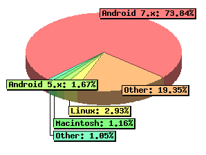 | 73.84 % | Android 7.x | | 19.35 % | Other | | 2.93 % | Linux | | 1.67 % | Android 5.x | | 1.16 % | Macintosh | | 0.44 % | iPhone | | 0.25 % | Android 1.x | | 0.20 % | Android 6.x | | 0.06 % | Android 8.x | | 0.03 % | Windows 7 | | 0.02 % | Android 4.x | | 0.01 % | iPad | | 0.01 % | Windows Vista | | 0.00 % | Android 9.x | | 0.00 % | Android 2.x | | 0.00 % | Unix | | 0.00 % | Windows NT | | 0.00 % | Windows XP | | 0.00 % | Windows 98 | | 0.00 % | Windows 8 | | 0.00 % | Windows 2003 Server | | 0.00 % | Windows 2000 | | 0.00 % | Windows 3.x | | 0.00 % | Windows 95 |